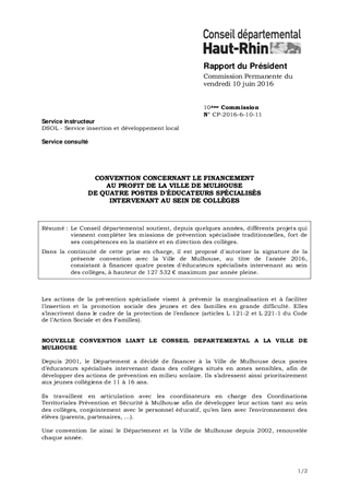 Le Conseil départemental soutient, depuis quelques années, différents projets qui viennent compléter les missions de prévention spécialisée traditionnelles, fort de ses compétences en la matière et en direction des collèges. Dans la continuité de cette prise en charge, il est proposé d'autoriser la signature de la présente convention avec la Ville de Mulhouse, au titre de l'année 2016, consistant à financer quatre postes d'éducateurs spécialisés intervenant au sein des collèges, à hauteur de 127 532 € maximum par année pleine.