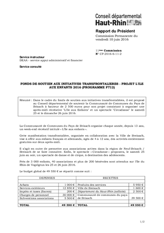 Dans le cadre du fonds de soutien aux initiatives transfrontalières, il est proposé au Conseil départemental de soutenir la Communauté de Communes du Pays de Brisach à hauteur de 2 500 euros pour son projet consistant à organiser une après-midi récréative "L'Ile aux Enfants" et un spectacle "Circadanse" le samedi 25 et le dimanche 26 juin 2016.