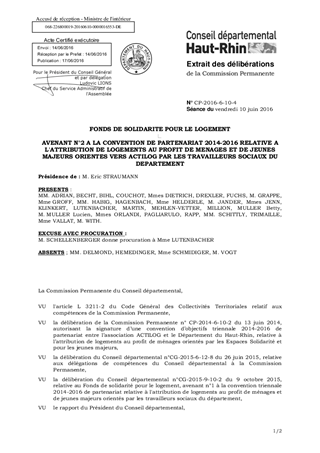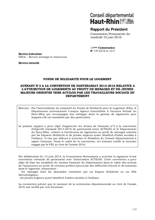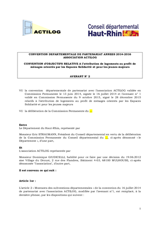 FONDS DE SOLIDARITE POUR LE LOGEMENTAVENANT N°2 A LA CONVENTION DE PARTENARIAT 2014-2016 RELATIVE A L'ATTRIBUTION DE LOGEMENTS AU PROFIT DE MENAGES ET DE JEUNES MAJEURS ORIENTES VERS ACTILOG PAR LES TRAVAILLEURS SOCIAUX DU DEPARTEMENT