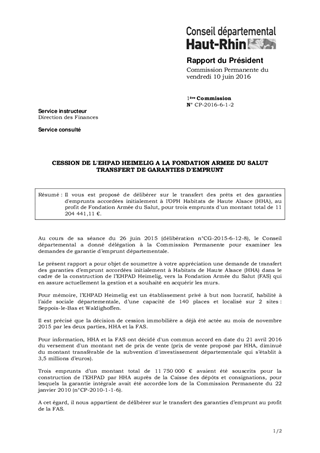 Il vous est proposé de délibérer sur le transfert des prêts et des garanties d'emprunts accordées initialement à l’OPH Habitats de Haute Alsace (HHA), au profit de Fondation Armée du Salut, pour trois emprunts d'un montant total de 11 204 441,11 €.