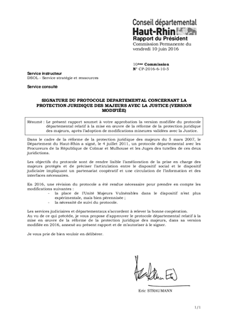 Le présent rapport soumet à votre approbation la version modifiée du protocole départemental relatif à la mise en œuvre de la réforme de la protection juridique des majeurs, après l’adoption de modifications mineures validées avec la Justice.