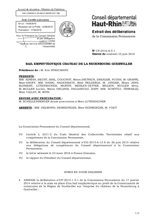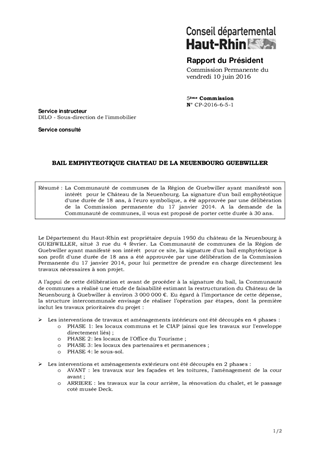 La Communauté de communes de la Région de Guebwiller ayant manifesté son intérêt pour le Château de la Neuenbourg. La signature d'un bail emphytéotique d'une durée de 18 ans, à l'euro symbolique, a été approuvée par une délibération de la Commission permanente du 17 janvier 2014. A la demande de la Communauté de communes, il vous est proposé de porter cette durée à 30 ans.