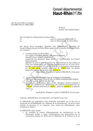 BAIL EMPHYTEOTIQUE CHATEAU DE LA NEUENBOURG GUEBWILLER
