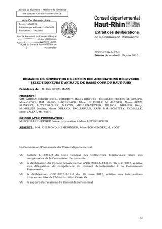 L'Union des Associations d’Eleveurs Sélectionneurs d’Animaux de Basse-Cour du Haut-Rhin organise son 17ème salon international d’aviculture les 11, 12 et 13 novembre 2016 à MULHOUSE. Il vous est proposé d’accorder une subvention de 2 000 € à prélever sur le fonds départemental pour la participation à des congrès ou manifestations à caractère national ou international se déroulant dans le Haut Rhin.