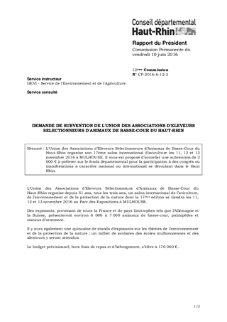 DEMANDE DE SUBVENTION DE L'UNION DES ASSOCIATIONS D'ELEVEURS SELECTIONNEURS D'ANIMAUX DE BASSE-COUR DU HAUT-RHIN