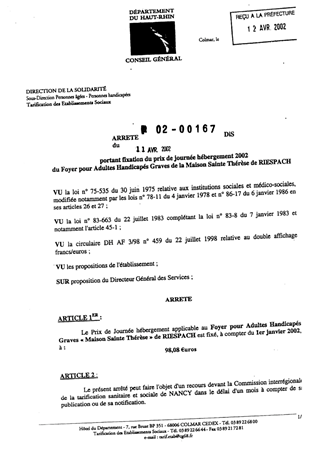Portant fixation du prix de journée hébergement 2002 du Foyer pour Adultes Handicapés Graves de la Maison Sainte Thérèse de RIESPACH Resumé Pièces jointes ARRETE Assemblée : Non défini Date : 11/04/2002 Rapporteur : Non défini Collectivité : Conseil départemental du Haut-Rhin Direction : Non défini Service : Service de la Tarification des Etablissements Domaine : Prix de Journée Commission :