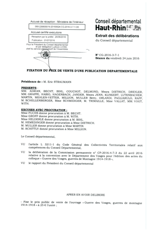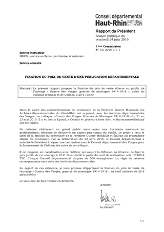 Le présent rapport propose la fixation du prix de vente directe au public de l’ouvrage « Guerre des Vosges, guerres de montagne 1914-1918 », actes du colloque d’Epinal et de Colmar, à 25 € l’unité