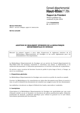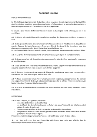 Le présent rapport a pour objet d'approuver le règlement intérieur de la Médiathèque Départementale du Sundgau et les tarifs réglementés pour les abonnements et les impressions.