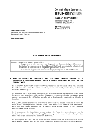 Le présent rapport a pour objet : - d’approuver la mise en oeuvre du dispositif des Contrats Uniques d’Insertion – Contrats d’Accompagnement dans l’Emploi (CUI-CAE) au sein de la collectivité et d’autoriser le recrutement de vingt-sept personnes à ce titre ; - de valider la suppression d’un emploi de psychologue à la Cité de l’Enfance.