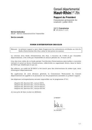 Le présent rapport a pour objet d'approuver les subventions attribuées au titre du fonds d'Intervention des élus, selon la liste jointe en annexe.