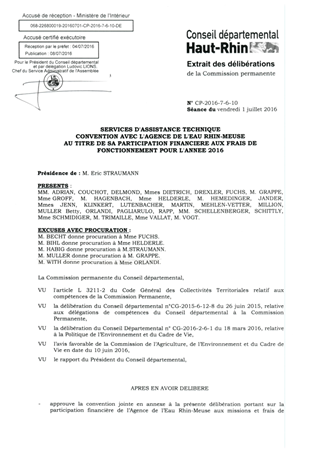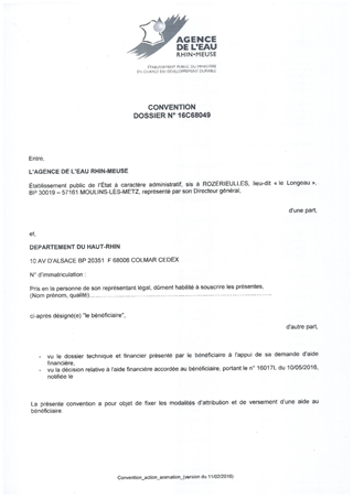 SERVICES D'ASSISTANCE TECHNIQUECONVENTION AVEC L'AGENCE DE L'EAU RHIN-MEUSEAU TITRE DE SA PARTICIPATION FINANCIERE AUX FRAIS DE FONCTIONNEMENT POUR L'ANNEE 2016