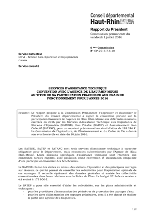 Le rapport propose à la Commission Permanente d'approuver et d'autoriser le Président du Conseil départemental à signer la convention portant sur la participation financière de l'Agence de l'Eau Rhin-Meuse aux différentes missions, exercées en 2016 par les Services d'Assistance Technique aux Exploitants de Stations d'Epuration (SATESE), Eau Potable (SATEP) et Assainissement Non Collectif (SATANC), pour un montant prévisionnel maximal d'aides de 198 246 €. La Commission de l’Agriculture, de l’Environnement et du Cadre de Vie a donné son avis favoravble en date du 10 juin 2016.