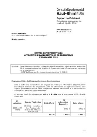 Dans le cadre du présent rapport et selon le règlement financier dans son article 9.6, il vous est proposé de procéder à l’ajustement des affectations par opération sur le programme : - A132 "Calibrage sur les routes départementales" (2 962 €).