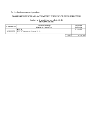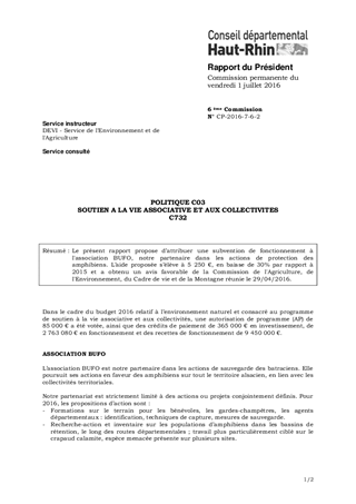 Le présent rapport propose d’attribuer une subvention de fonctionnement à l'association BUFO, notre partenaire dans les actions de protection des amphibiens. L’aide proposée s’élève à 5 250 €, en baisse de 30% par rapport à 2015 et a obtenu un avis favorable de la Commission de l'Agriculture, de l'Environnement, du Cadre de vie et de la Montagne réunie le 29/04/2016.