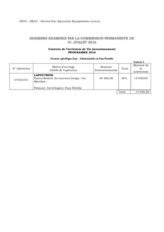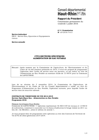 Après examen par la Commission de l'Agriculture, de l'Environnement et du Cadre de vie des dossiers présentés en 2014, il vous est proposé de programmer l'opération dont l'ordre de service nous est parvenu, ce qui induit au titre de l'Alimentation en Eau Potable un montant d'aide de 13 950 € pour la Commune de LAPOUTROIE