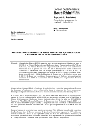 L'Association Réseau IDEAL organise avec ses partenaires privilégiés que sont le SIVOM de la Région Mulhousienne, Mulhouse Alsace Agglomération et la Ville de Mulhouse, les 4èmes Rencontres "Aquaterritorial, le salon des collectivités innovantes dans la gestion de l'eau", les 21 et 22 septembre 2016 au Parc des Expositions à Mulhouse. Sur un budget prévisionnel de 270 000 € TTC, le groupement mulhousien apporterait une aide de 61 200 €, l'Agence de l'Eau Rhin-Meuse une aide de 24 000 €, la Chambre de Commerce et de l'Industrie une aide de 18 000 €. Dans ces conditions, il vous est proposé d'allouer une participation forfaitaire de 3 500 € à l'Association Réseau IDEAL pour l'organisation de cette manifestation.