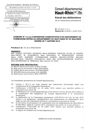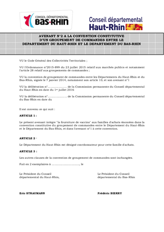 AVENANT N° 2 A LA CONVENTION CONSTITUTIVE D'UN GROUPEMENT DE COMMANDES ENTRE LE DEPARTEMENT DU HAUT-RHIN ET DU BAS-RHIN SIGNEE LE 7 JANVIER 2014