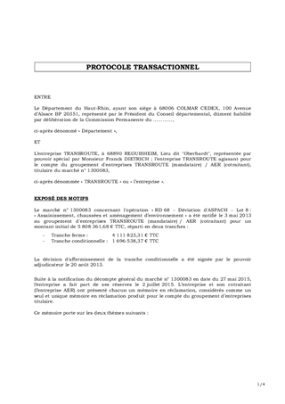 PROTOCOLE TRANSACTIONNELRD 68 - DEVIATION D'ASPACHMARCHÉ N° 1300083LOT 8 : ASSAINISSEMENT, CHAUSSÉES ET AMÉNAGEMENT D'ENVIRONNEMENT