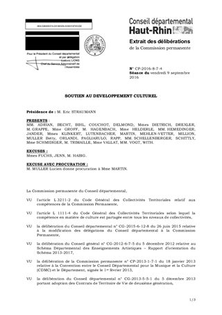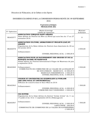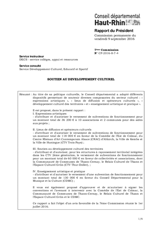 Au titre de sa politique culturelle, le Conseil départemental a adopté différents dispositifs permettant de soutenir diverses composantes du secteur culturel : « expressions artistiques », « lieux de diffusion et opérateurs culturels », « développement culturel des territoires » et « enseignement artistique et pratique ». Il est proposé, dans le présent rapport : I. Expressions artistiques - d’attribuer et d'autoriser le versement de subventions de fonctionnement pour un montant total de 36 200 € à 10 associations et 2 communes pour des aides aux projets ; II. Lieux de diffusion et opérateurs culturels - d’attribuer et d'autoriser le versement de subventions de fonctionnement pour un montant total de 118 000 € en faveur de la Comédie de l’Est de Colmar, du Centre Rhénan d’Art Contemporain Alsace (CRAC) d’Altkirch, la Ville de Kembs et la Ville de Huningue (CTV Trois Pays) ; III. Soutien au développement culturel des territoires - d’attribuer et d'autoriser, pour les structures à rayonnement territorial intégrées dans les CTV 2ème génération, le versement de subventions de fonctionnement pour un montant total de 60 000 € en faveur de collectivités et associations, dont la Communauté de Communes de Thann-Cernay, le Relais Culturel de Thann et l’Espace Culturel Grün (CTV Thur-Doller), ; IV. Enseignement artistique et pratique - d’attribuer et d'autoriser le versement d’une subvention de fonctionnement pour un montant total de 130 000 € en faveur du Conseil Départemental pour la Musique et la Culture (CDMC) ; Il vous est également proposé d’approuver et de m'autoriser à signer les conventions et l’avenant à intervenir avec la Comédie de l’Est de Colmar, la Communauté de Communes de Thann-Cernay, le Relais Culturel de Thann et l’Espace Culturel Grün et le CDMC. Ce rapport a fait l’objet d’un avis favorable de la 7ème Commission réunie le 1er juillet 2016.
