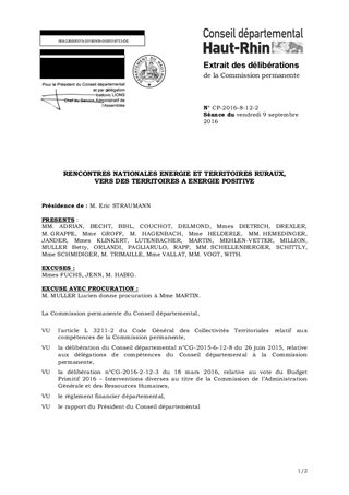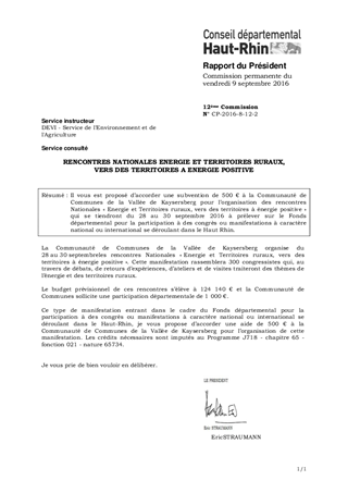 Il vous est proposé d’accorder une subvention de 500 € à la Communauté de Communes de la Vallée de Kaysersberg pour l’organisation des rencontres Nationales « Energie et Territoires ruraux, vers des territoires à énergie positive » qui se tiendront du 28 au 30 septembre 2016 à prélever sur le Fonds départemental pour la participation à des congrès ou manifestations à caractère national ou international se déroulant dans le Haut Rhin.