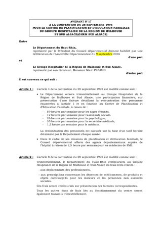 Pour l’année 2016, il est proposé d’accorder une participation financière de 403 809 euros pour assurer le fonctionnement des sept Centres de Planification et d’Education Familiale (CPEF), adossés aux centres hospitaliers pour le compte du Département. Les modifications concernant les quotités horaires d’intervention de certains personnels mis à disposition par le Groupe Hospitalier de la Région de Mulhouse et Sud Alsace (GHRM Sud Alsace) et le Groupement de Coopération Sanitaire, Nouvelle Clinique des Trois Frontières (GCS Nouvelle Clinique des Trois Frontières) nécessitent une actualisation des avenants.