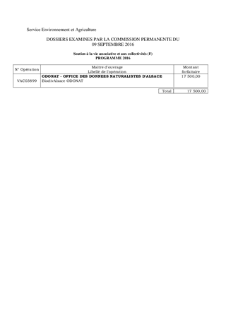 Le présent rapport propose d’attribuer une subvention de fonctionnement à l'association ODONAT, notre partenaire dans les actions d’inventaire et de diffusion des données naturalistes haut-rhinoises. L’aide proposée s’élève à 17 500 €, en baisse de 30% par rapport à 2015, à l’instar des autres structures du secteur associatif. Ce rapport a fait l'objet d'un avis favorable de la Commission de l'Agriculture, de l'Environnement et du Cadre de Vie réunie le 10 juin 2016.