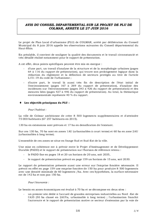 AVIS SUR LE PROJET DE PLU ARRETE LE 27 JUIN 2016 DE LA VILLE DE COLMAR