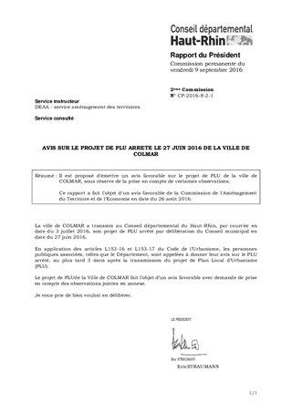 Il est proposé d'émettre un avis favorable sur le projet de PLU de la ville de COLMAR, sous réserve de la prise en compte de certaines observations. Ce rapport a fait l'objet d'un avis favorable de la Commission de l'Aménagement du Territoire et de l'Economie en date du 26 août 2016.