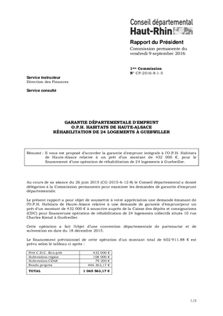 Il vous est proposé d’accorder la garantie d'emprunt intégrale à l’O.P.H. Habitats de Haute-Alsace relative à un prêt d’un montant de 432 000 €, pour le financement d’une opération de réhabilitation de 24 logements à Guebwiller.