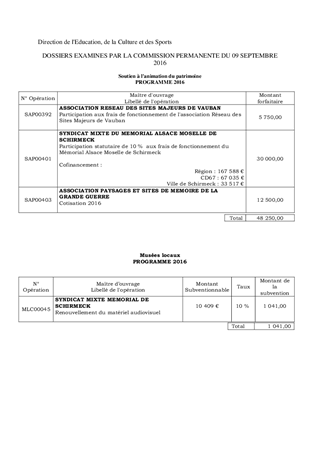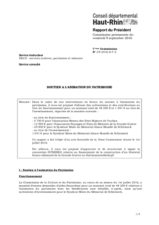 Dans le cadre de nos interventions en faveur du soutien à l’animation du patrimoine, il vous est proposé d’allouer des subventions et des contributions au titre du fonctionnement pour un montant total de 48 250 € et 1 041 € au titre de l’investissement, réparties de la manière suivante : - au titre du fonctionnement : - 5 750 € pour l’Association Réseau des Sites Majeurs de Vauban - 12 500 € pour l’Association Paysages et Sites de Mémoire de la Grande Guerre - 30 000 € pour le Syndicat Mixte du Mémorial Alsace Moselle de Schirmeck - au titre de l’investissement : 1 041 € pour le Syndicat Mixte du Mémorial Alsace Moselle de Schirmeck Ce rapport a fait l’objet d’un avis favorable de la 7ème Commission réunie le 1er juillet 2016. Par ailleurs, il vous est proposé d’approuver et de m'autoriser à signer la convention INTERREG relative au financement de la construction d’un Historial franco-allemand de la Grande Guerre au Hartmannswillerkopf.