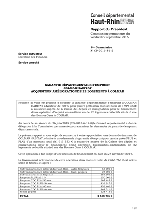 GARANTIE DÉPARTEMENTALE D'EMPRUNTCOLMAR HABITATACQUISITION AMÉLIORATION DE 22 LOGEMENTS À COLMAR