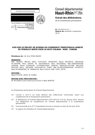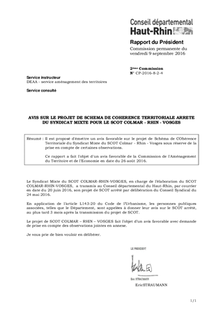 Il est proposé d'émettre un avis favorable sur le projet de Schéma de COhérence Territoriale du Syndicat Mixte du SCOT Colmar - Rhin - Vosges sous réserve de la prise en compte de certaines observations. Ce rapport a fait l'objet d'un avis favorable de la Commission de l'Aménagement du Territoire et de l'Economie en date du 26 août 2016.