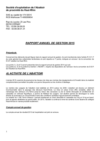 DÉLÉGATION DE SERVICE PUBLIC DE L'EXPLOITATION DE L'ABATTOIR DÉPARTEMENTAL DE CERNAYCOMMUNICATION DU RAPPORT ANNUEL DE GESTION 2015 DU DÉLÉGATAIRE