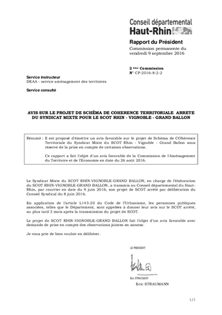Il est proposé d'émettre un avis favorable sur le projet de Schéma de COhérence Territoriale du Syndicat Mixte du SCOT Rhin - Vignoble - Grand Ballon sous réserve de la prise en compte de certaines observations. Ce rapport a fait l'objet d'un avis favorable de la Commission de l'Aménagement du Territoire et de l'Economie en date du 26 août 2016.