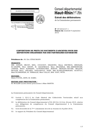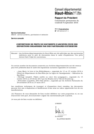 Les Archives départementales du Haut-Rhin ont été sollicitées par des partenaires extérieurs pour le prêt de documents dans le cadre d’expositions. Ces prêts doivent faire l’objet de conventions.