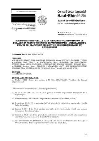 SOLIDARITE TERRITORIALE HAUT-RHINOISE : TRANSFORMATION DE L'ADAUHR EN AGENCE TECHNIQUE DÉPARTEMENTALE - APPROBATION DU PROJET DE STATUTS ET DÉSIGNATION DES REPRÉSENTANTS DU DÉPARTEMENT