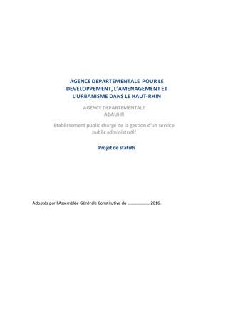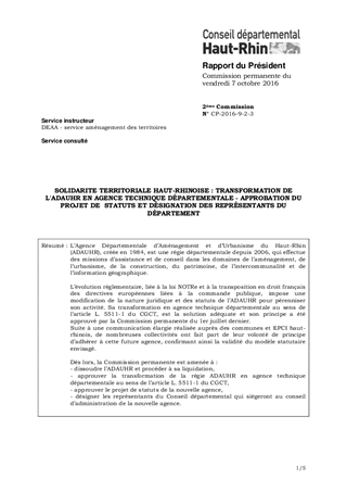 L’Agence Départementale d’Aménagement et d’Urbanisme du Haut-Rhin (ADAUHR), créée en 1984, est une régie départementale depuis 2006, qui effectue des missions d’assistance et de conseil dans les domaines de l’aménagement, de l’urbanisme, de la construction, du patrimoine, de l’intercommunalité et de l’information géographique. L’évolution réglementaire, liée à la loi NOTRe et à la transposition en droit français des directives européennes liées à la commande publique, impose une modification de la nature juridique et des statuts de l’ADAUHR pour pérenniser son activité. Sa transformation en agence technique départementale au sens de l’article L. 5511-1 du CGCT, est la solution adéquate et son principe a été approuvé par la Commission permanente du 1er juillet dernier. Suite à une communication élargie réalisée auprès des communes et EPCI haut-rhinois, de nombreuses collectivités ont fait part de leur volonté de principe d’adhérer à cette future agence, confirmant ainsi la validité du modèle statutaire envisagé. Dès lors, la Commission permanente est amenée à : - dissoudre l’ADAUHR et procéder à sa liquidation, - approuver la transformation de la régie ADAUHR en agence technique départementale au sens de l’article L. 5511-1 du CGCT, - approuver le projet de statuts de la nouvelle agence, - désigner les représentants du Conseil départemental qui siègeront au conseil d’administration de la nouvelle agence.
