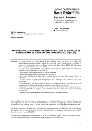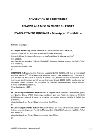 Le Département du Haut-Rhin a été sollicité pour participer au projet de sensibilisation aux économies d’énergies, intitulé « Mon appartement éco-malin », mené en partenariat avec le Département du Bas-Rhin, EDF, ES (Energies Strasbourg), Caritas Alsace et l’AREAL. Il s’agit d’un appartement pédagogique itinérant sur l’ensemble du territoire régional, équipé par EDF et destiné à : • sensibiliser, informer et éduquer aux éco-gestes, • limiter la consommation d’énergie des ménages, • favoriser l’utilisation d’énergies renouvelables et leur bon usage dans le logement, • lutter contre la précarité énergétique des ménages aux revenus les plus modestes. Le Département du Haut-Rhin a cédé au Département du Bas-Rhin, à titre gracieux, un bibliobus inutilisé en guise de contribution au projet. L’objet du présent rapport concerne la validation de la convention de partenariat fixant les objectifs du projet et les contributions des partenaires pour une durée de 24 mois. Cette action n’engage pas de financement propre du Département.