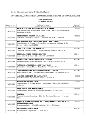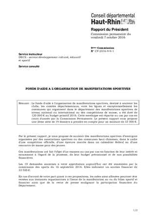 Le fonds d'aide à l'organisation de manifestations sportives, destiné à soutenir les clubs, les comités départementaux, voire les ligues et exceptionnellement les communes qui organisent dans le département des manifestations sportives de niveau national ou international ou des compétitions de masse, a été doté de 120 000 € au budget primitif 2016. Cette enveloppe est répartie au cas par cas en cours d'année par la Commission Permanente. Le présent rapport vous propose une 2ème série de 19 dossiers à prendre en compte pour un montant de 33 500 €.