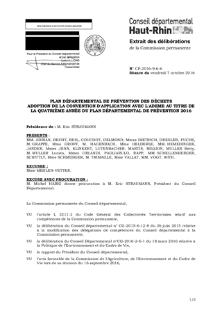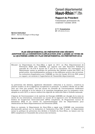 PLAN DÉPARTEMENTAL DE PRÉVENTION DES DÉCHETS ADOPTION DE LA CONVENTION D'APPLICATION AVEC L'ADEME AU TITRE DE LA QUATRIÈME ANNÉE DU PLAN DÉPARTEMENTAL DE PRÉVENTION 2016