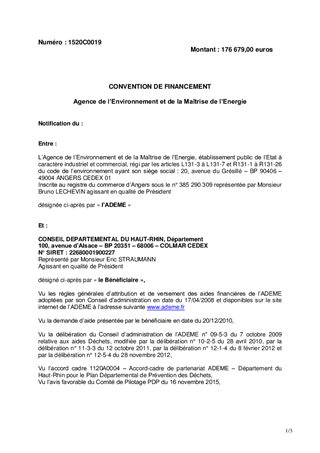 Le Département du Haut-Rhin a signé en 2011 un Plan Départemental de Prévention (PDP) avec l’ADEME, qui apporte une aide financière forfaitaire annuelle de 176 679 € durant les 5 ans de la convention. En contrepartie, le Département anime la politique de prévention des déchets auprès des EPCI, du grand public, des établissements scolaires et des différents acteurs des territoires. La convention d’application avec l’ADEME au titre de l’année 2016 du PDP, jointe au rapport, est soumise à l’approbation de l’Assemblée départementale.