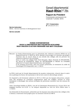 Le fonds d'Intervention pour la prévention des violences scolaires (FIVS) est un dispositif doté de 31 000 € en 2016, destiné à encourager et à soutenir des projets d'actions mis en œuvre dans et aux abords des collèges afin de prévenir les violences scolaires et les incivilités. Dans ce cadre, les collèges Wolf, Saint-Exupéry, Macé, Kennedy de MULHOUSE, De Nerval de HUNINGUE, Peguy de WITTELSHEIM et Molière de COLMAR sollicitent le Conseil départemental pour neuf projets. Il est proposé d'autoriser, pour les actions présentées, le versement du solde de l’enveloppe FIVS disponible, soit 11 820 €.