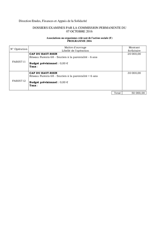 Il vous est proposé d’approuver la signature d’une convention avec la Caisse d’Allocations Familiales du Haut-Rhin, délégataire des fonds alloués par le Département dans le cadre du dispositif Réseau Parents 68 pour le financement des actions de soutien à la parentalité pour un montant total de 50 000 €. Pour mémoire, la subvention départementale versée à ce titre, pour 2015, a représenté un montant de 46 300 € au regard d’une enveloppe prévisionnelle identique à celle de 2016, à savoir 50 000 €. L’instruction des projets correspond, en 2016, à un montant de 50 000 €.
