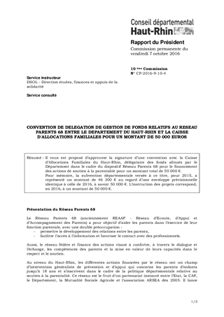 CONVENTION DE DELEGATION DE GESTION DE FONDS RELATIFS AU RESEAU PARENTS 68 ENTRE LE DEPARTEMENT DU HAUT-RHIN ET LA CAISSE D'ALLOCATIONS FAMILIALES POUR UN MONTANT DE 50 000 EUROS