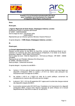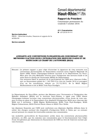 Le présent rapport a pour objet d’autoriser la signature de cinq avenants aux conventions pluriannuelles de financement conclues entre l’Agence Régionale de Santé (ARS) Alsace Champagne-Ardenne Lorraine et le Département du Haut-Rhin pour les cinq Méthodes d'Action pour l'Intégration des services d'aide et de soins dans le champ de l'Autonomie (MAIA) du Département. Ces avenants fixent le montant de la participation de l’ARS pour chacune d'elles, soit un financement global de 1 182 595 € au titre de l’année 2016 et prorogent d’un an les conventions, échues au 31/12/2015, de la MAIA Région Mulhousienne et de la MAIA Trois Pays Sundgau.