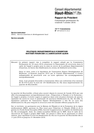 Le présent rapport vise à compléter le rapport adopté par la Commission Permanente du 24 mars 2016 concernant le financement de structures dans le cadre de l’appel à projets pour la mise en œuvre de la politique départementale d’insertion, en faveur des bénéficiaires du revenu de Solidarité active (rSa). Dans ce sens, suite à la liquidation de l’association Espace Développement de Mulhouse, co-financée jusqu’en 2015 par le Conseil départemental, il s’avère indispensable de poursuivre avec un autre opérateur ces accompagnements socioprofessionnels. Ainsi, il est proposé d’accorder à l’association Aléos une subvention d’un montant de 26 075 € pour le suivi de 135 bénéficiaires du rSa issus majoritairement du quartier de Bourtzwiller.
