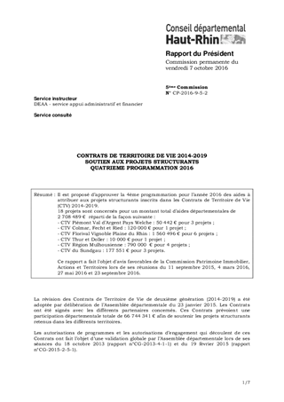 Il est proposé d’approuver la 4ème programmation pour l’année 2016 des aides à attribuer aux projets structurants inscrits dans les Contrats de Territoire de Vie (CTV) 2014-2019. 18 projets sont concernés pour un montant total d’aides départementales de 2 708 489 € réparti de la façon suivante : - CTV Piémont Val d’Argent Pays Welche : 50 442 € pour 3 projets ; - CTV Colmar, Fecht et Ried : 120 000 € pour 1 projet ; - CTV Florival Vignoble Plaine du Rhin : 1 560 496 € pour 6 projets ; - CTV Thur et Doller : 10 000 € pour 1 projet ; - CTV Région Mulhousienne : 790 000 € pour 4 projets ; - CTV du Sundgau : 177 551 € pour 3 projets. Ce rapport a fait l'objet d'avis favorables de la Commission Patrimoine Immobilier, Actions et Territoires lors de ses réunions du 11 septembre 2015, 4 mars 2016, 27 mai 2016 et 23 septembre 2016.