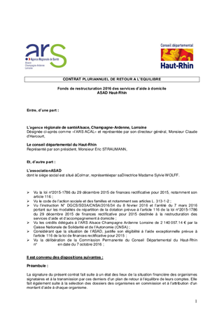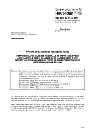 ACTIONS EN FAVEUR DES PERSONNES AGEESCONVENTION AVEC L'AGENCE REGIONALE DE SANTE (ARS) ET LES ASSOCIATIONS D'AIDE A DOMICILE POUR L'ATTRIBUTION D'UNE SUBVENTION DANS LE CADRE DU FONDS DE RESTRUCTURATION DES SERVICES D'AIDE A DOMICILE
