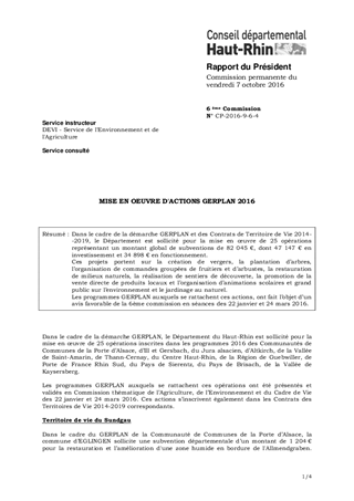 Dans le cadre de la démarche GERPLAN et des Contrats de Territoire de Vie 2014-2019, le Département est sollicité pour la mise en œuvre de 25 opérations représentant un montant global de subventions de 82 045 €, dont 47 147 € en investissement et 34 898 € en fonctionnement. Ces projets portent sur la création de vergers, la plantation d’arbres, l’organisation de commandes groupées de fruitiers et d’arbustes, la restauration de milieux naturels, la réalisation de sentiers de découverte, la promotion de la vente directe de produits locaux et l’organisation d’animations scolaires et grand public sur l’environnement et le jardinage au naturel. Les programmes GERPLAN auxquels se rattachent ces actions, ont fait l’objet d’un avis favorable de la 6ème commission en séances des 22 janvier et 24 mars 2016.