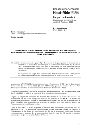 Le présent rapport a pour objet de décider de la prorogation de la durée de la validité de la subvention accordée par la Commission Permanente du 4 octobre 2013 à la commune d'UFFHOLTZ pour la révision de son Plan d'Occupation des Sols et transformation en Plan Local d'Urbanisme, afin de pouvoir procéder à son versement. Ce rapport a fait l'objet d'un avis favorable de la Commission de l'Aménagement du Territoire et de l'Economie lors de la réunion en date du 26 août 2016.